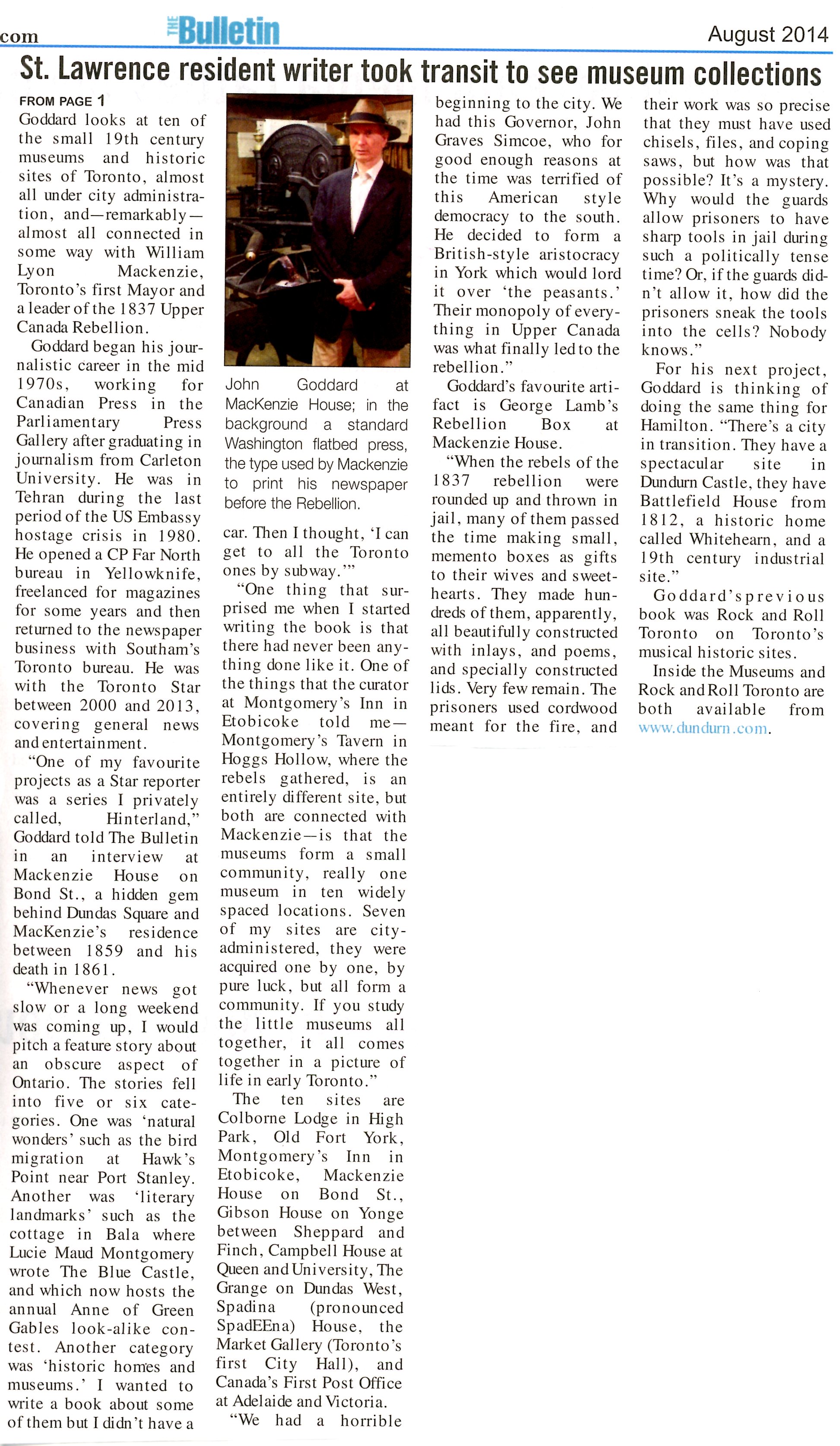 He went instead to Mackenzie House, a city museum, for the launch of John Goddard’s book, Inside Toronto’s Museums.